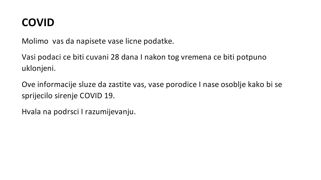 COVID Molimo vas da napisete vase licne podatke. Vasi podaci ce biti cuvani 28 dana I nakon tog vremena ce biti potpuno uklonjeni. Ove informacije sluze da zastite vas, vase porodice I nase osoblje kako bi se sprijecilo sirenje COVID 19. Hvala na podrsci I razumijevanju.