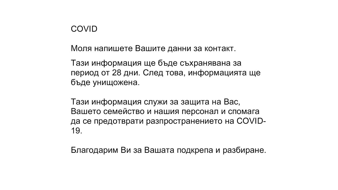 COVID Mоля напишете Вашите данни за контакт. Тази информация ще бъде съхранявана за период от 28 дни. След това, информацията ще бъде унищожена. Тази информация служи за защита на Вас, Вашето семейство и нашия персонал и спомага да се предотврати разпространението на COVID-19. Благодарим Ви за Вашата подкрепа и разбиране.