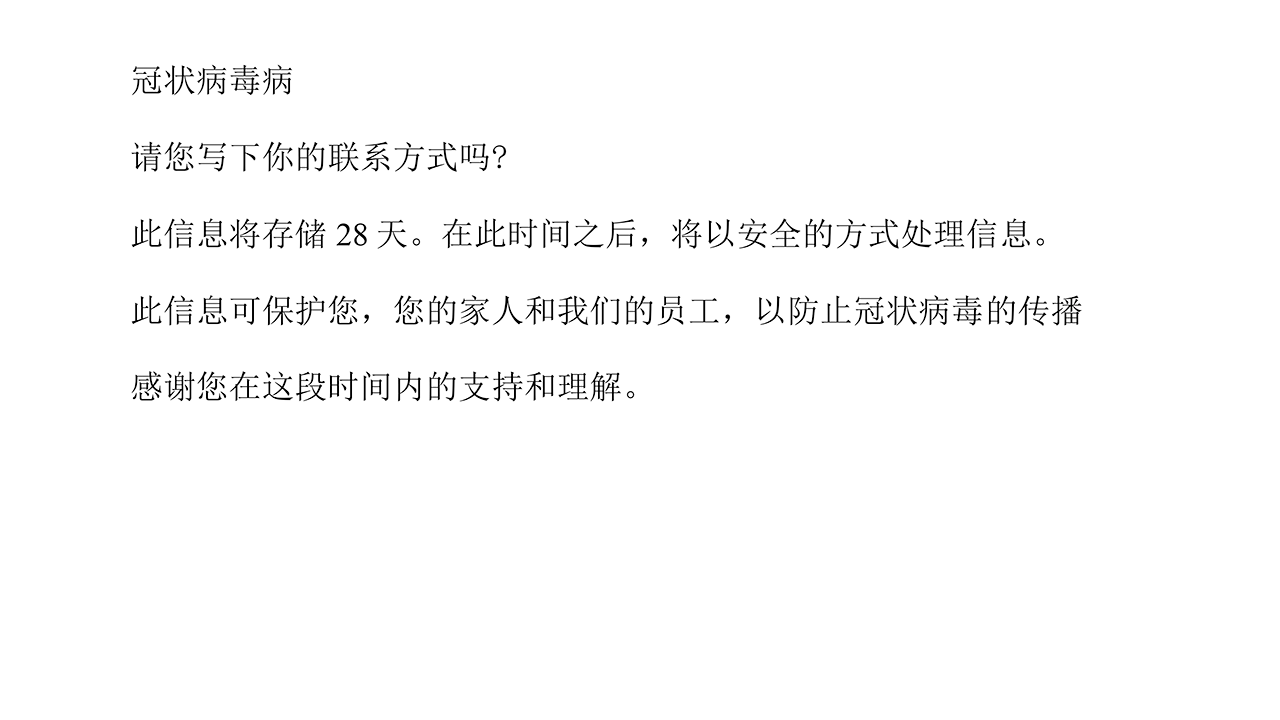 冠状病毒病 请您写下你的联系方式吗? 此信息将存储28天。在此时间之后,将以安全的方式处理信息。 此信息可保护您,您的家人和我们的员工,以防止冠状病毒的传播 感谢您在这段时间内的支持和理解。