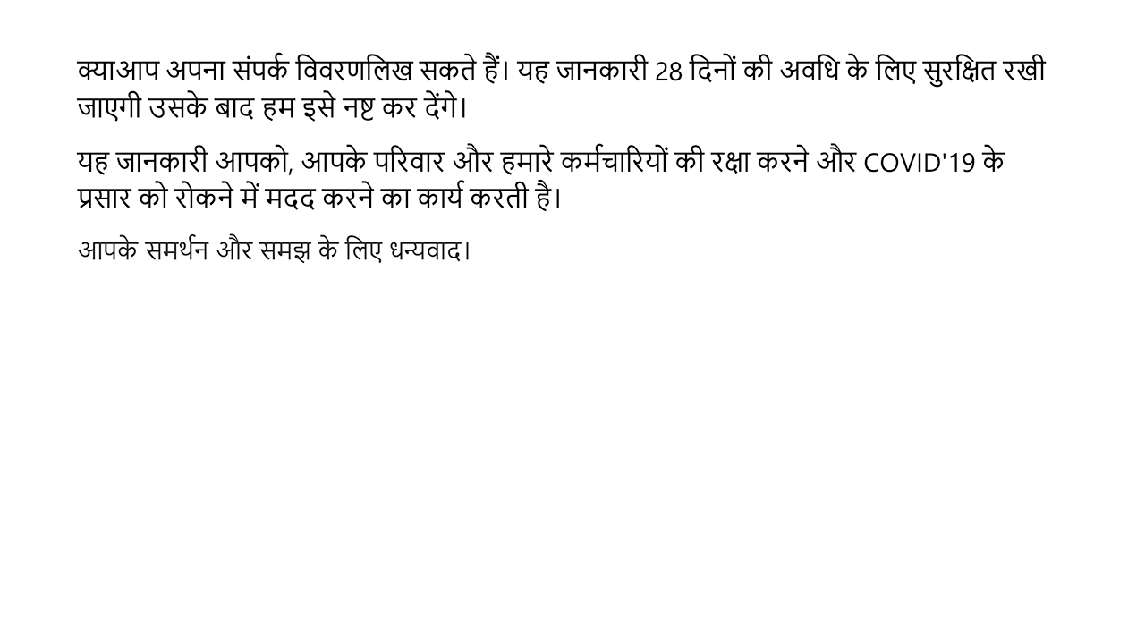 क्याआप अपना संपर्क विवरणलिख सकते हैं। यह जानकारी 28 दिनों की अवधि के लिए सुरक्षित रखी जाएगी उसके बाद हम इसे नष्ट कर देंगे। यह जानकारी आपको, आपके परिवार और हमारे कर्मचारियों की रक्षा करने और COVID'19 के प्रसार को रोकने में मदद करने का कार्य करती है। आपके समर्थन और समझ के लिए धन्यवाद।