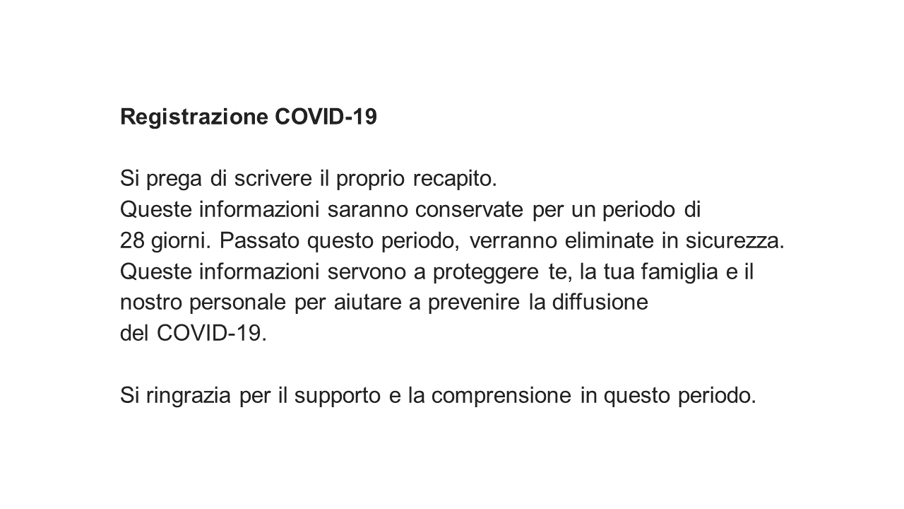 Registrazione COVID-19 Si prega di scrivere il proprio recapito. Queste informazioni saranno conservate per un periodo di 28 giorni. Passato questo periodo, verranno eliminate in sicurezza. Queste informazioni servono a proteggere te, la tua famiglia e il nostro personale per aiutare a prevenire la diffusione del COVID-19. Si ringrazia per il supporto e la comprensione in questo periodo.