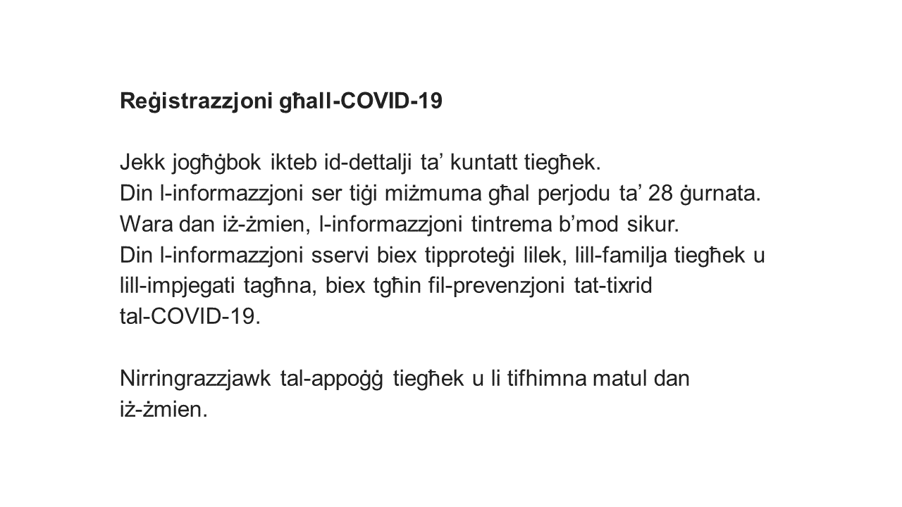 Reġistrazzjoni għall-COVID-19 Jekk jogħġbok ikteb id-dettalji ta’ kuntatt tiegħek. Din l-informazzjoni ser tiġi miżmuma għal perjodu ta’ 28 ġurnata. Wara dan iż-żmien, l-informazzjoni tintrema b’mod sikur. Din l-informazzjoni sservi biex tipproteġi lilek, lill-familja tiegħek u lill-impjegati tagħna, biex tgħin fil-prevenzjoni tat-tixrid tal-COVID-19. Nirringrazzjawk tal-appoġġ tiegħek u li tifhimna matul dan iż-żmien.