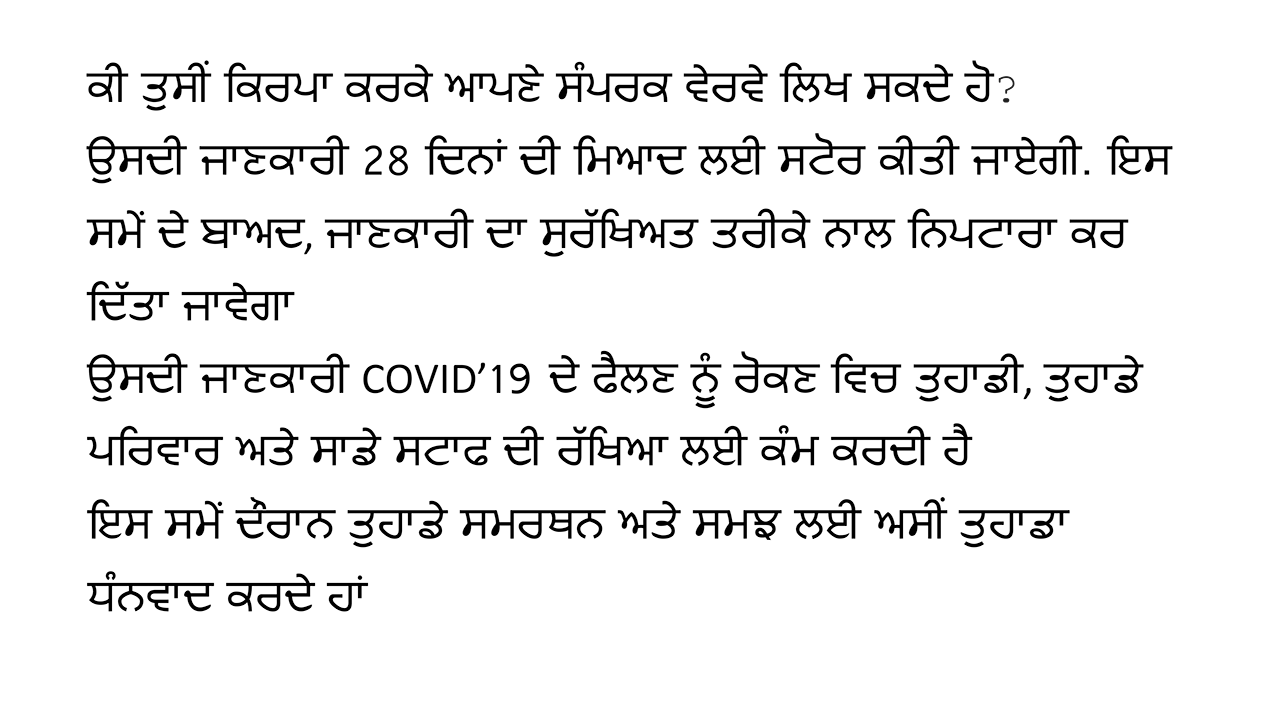 ਕੀ ਤੁਸੀਂ ਕਿਰਪਾ ਕਰਕੇ ਆਪਣੇ ਸੰਪਰਕ ਵੇਰਵੇ ਲਿਖ ਸਕਦੇ ਹੋ? ਉਸਦੀ ਜਾਣਕਾਰੀ 28 ਦਿਨਾਂ ਦੀ ਮਿਆਦ ਲਈ ਸਟੋਰ ਕੀਤੀ ਜਾਏਗੀ. ਇਸ ਸਮੇਂ ਦੇ ਬਾਅਦ, ਜਾਣਕਾਰੀ ਦਾ ਸੁਰੱਖਿਅਤ ਤਰੀਕੇ ਨਾਲ ਨਿਪਟਾਰਾ ਕਰ ਦਿੱਤਾ ਜਾਵੇਗਾ ਉਸਦੀ ਜਾਣਕਾਰੀ COVID’19 ਦੇ ਫੈਲਣ ਨੂੰ ਰੋਕਣ ਵਿਚ ਤੁਹਾਡੀ, ਤੁਹਾਡੇ ਪਰਿਵਾਰ ਅਤੇ ਸਾਡੇ ਸਟਾਫ ਦੀ ਰੱਖਿਆ ਲਈ ਕੰਮ ਕਰਦੀ ਹੈ ਇਸ ਸਮੇਂ ਦੌਰਾਨ ਤੁਹਾਡੇ ਸਮਰਥਨ ਅਤੇ ਸਮਝ ਲਈ ਅਸੀਂ ਤੁਹਾਡਾ ਧੰਨਵਾਦ ਕਰਦੇ ਹਾਂ