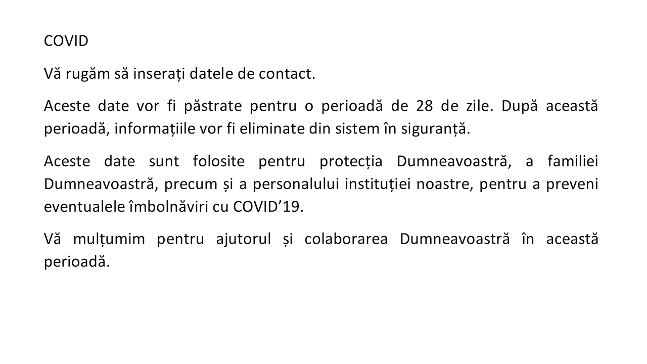 COVID Vă rugăm să inserați datele de contact. Aceste date vor fi păstrate pentru o perioadă de 28 de zile. După această perioadă, informațiile vor fi eliminate din sistem în siguranță. Aceste date sunt folosite pentru protecția Dumneavoastră, a familiei Dumneavoastră, precum și a personalului instituției noastre, pentru a preveni eventualele îmbolnăviri cu COVID’19. Vă mulțumim pentru ajutorul și colaborarea Dumneavoastră în această perioadă.