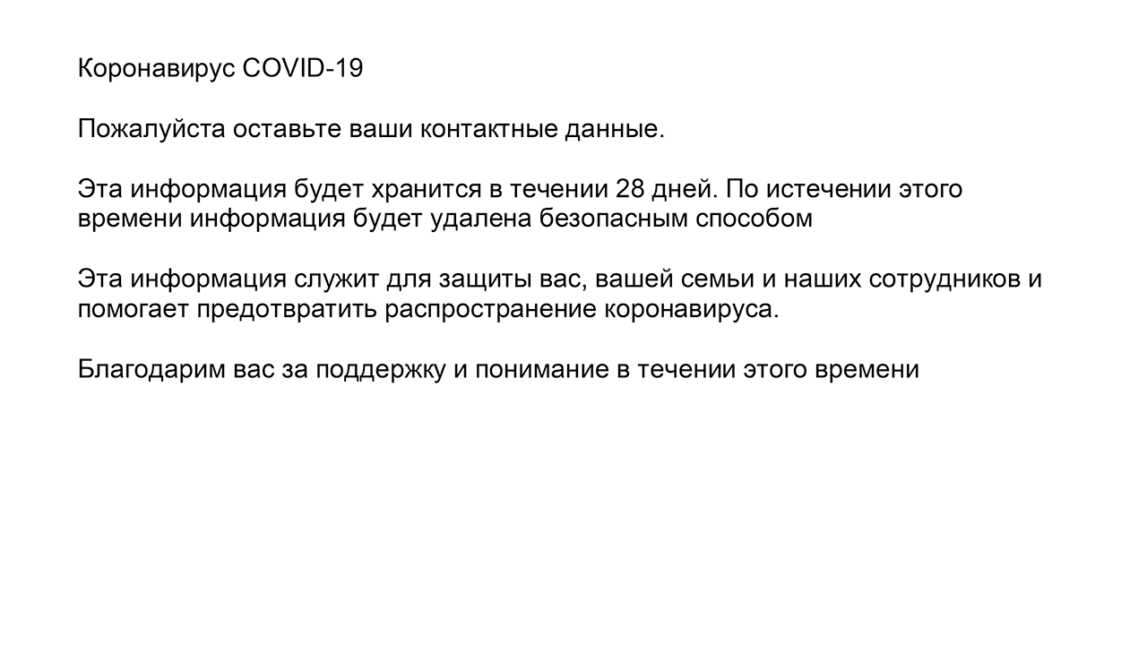 Коронавирус COVID-19 Пожалуйста оставьте ваши контактные данные. Эта информация будет хранится в течении 28 дней. По истечении этого времени информация будет удалена безопасным способом Эта информация служит для защиты вас, вашей семьи и наших сотрудников и помогает предотвратить распространение коронавируса. Благодарим вас за поддержку и понимание в течении этого времени