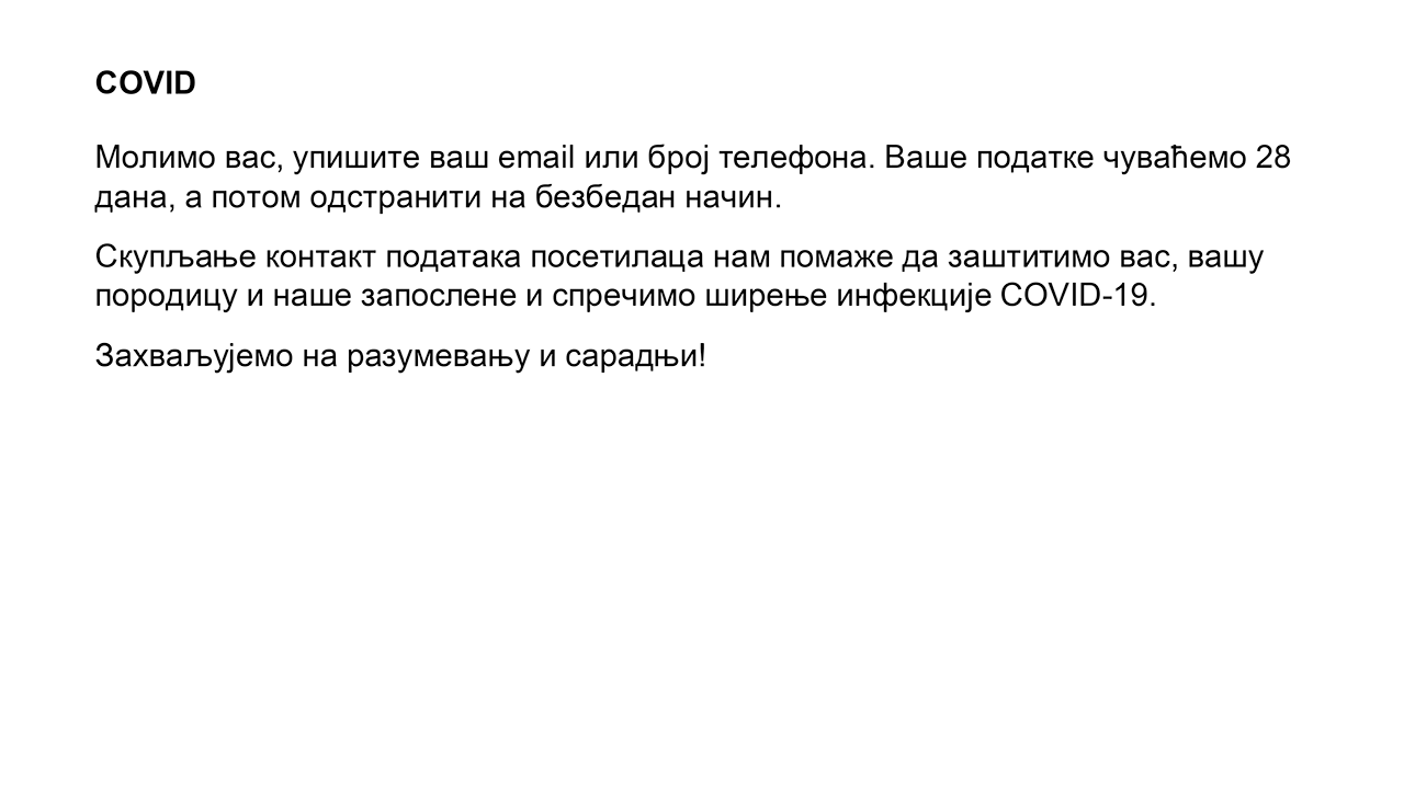 COVID Молимо вас, упишите ваш email или број телефона. Ваше податке чуваћемо 28 дана, а потом одстранити на безбедан начин. Скупљање контакт података посетилаца нам помаже да заштитимо вас, вашу породицу и наше запослене и спречимо ширење инфекције COVID-19. Захваљујемо на разумевању и сарадњи!