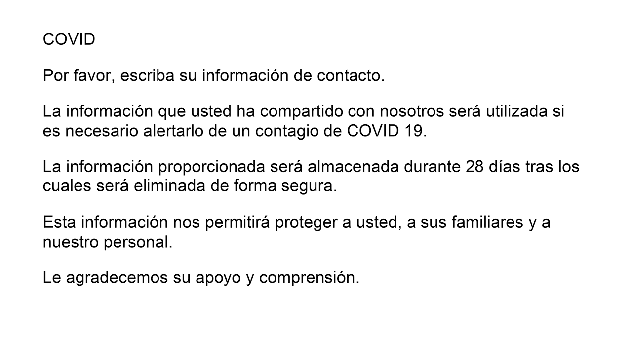 COVID Por favor, escriba su información de contacto. La información que usted ha compartido con nosotros será utilizada si es necesario alertarlo de un contagio de COVID 19. La información proporcionada será almacenada durante 28 días tras los cuales será eliminada de forma segura. Esta información nos permitirá proteger a usted, a sus familiares y a nuestro personal. Le agradecemos su apoyo y comprensión.