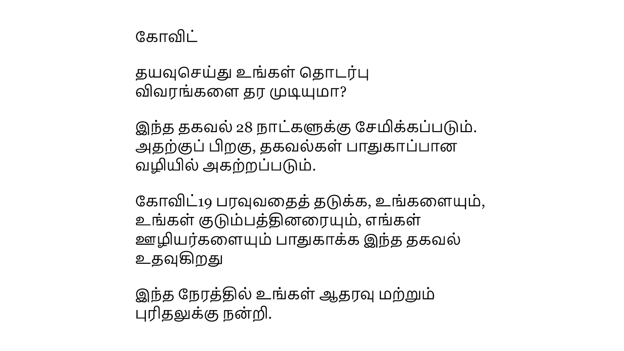 கோவிட் தயவுசெய்து உங்கள் தொடர்பு விவரங்களை தர முடியுமா? இந்த தகவல் 28 நாட்களுக்கு சேமிக்கப்படும். அதற்குப் பிறகு, தகவல்கள் பாதுகாப்பான வழியில் அகற்றப்படும். கோவிட்19 பரவுவதைத் தடுக்க, உங்களையும், உங்கள் குடும்பத்தினரையும், எங்கள் ஊழியர்களையும் பாதுகாக்க இந்த தகவல் உதவுகிறது இந்த நேரத்தில் உங்கள் ஆதரவு மற்றும் புரிதலுக்கு நன்றி.
