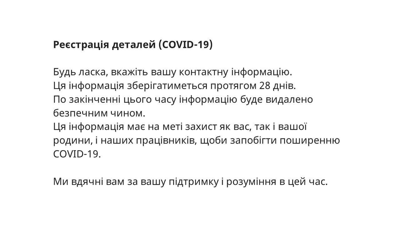 Реєстрація деталей (COVID-19) Будь ласка, вкажіть вашу контактну інформацію. Ця інформація зберігатиметься протягом 28 днів. По закінченні цього часу інформацію буде видалено безпечним чином. Ця інформація має на меті захист як вас, так і вашої родини, і наших працівників, щоби запобігти поширенню COVID-19. Ми вдячні вам за вашу підтримку і розуміння в цей час.